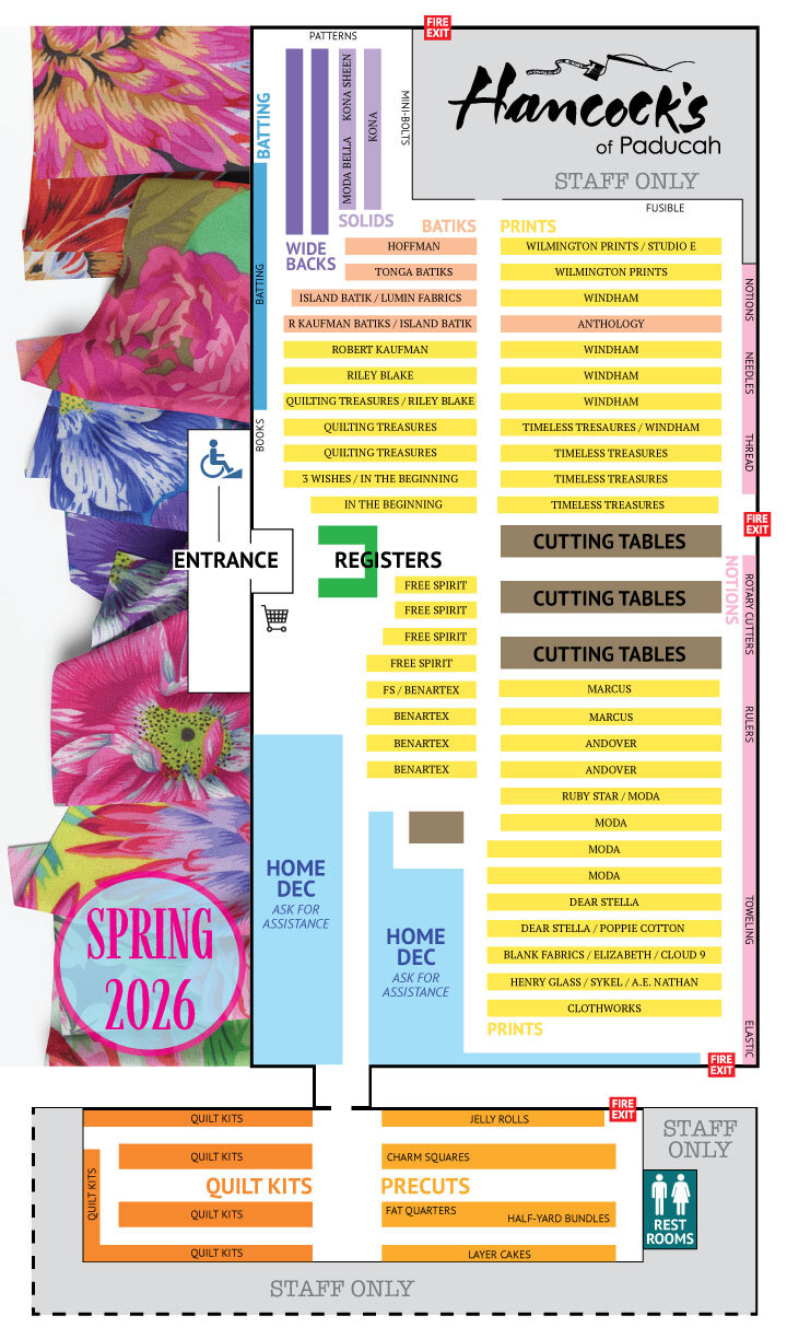 Hancock's of Paducah welcomes you to Paducah, Kentucky for the 2026 Spring QuiltWeek. We are thrilled to host the BEST customers in our wonderful city. We offer the latest fabric collections, precuts of all sizes & quilt kits of every level. As always, we have an enormous selection of closeout fabrics on sale. Stop by and build your stash at Hancock's of Paducah during your stay!